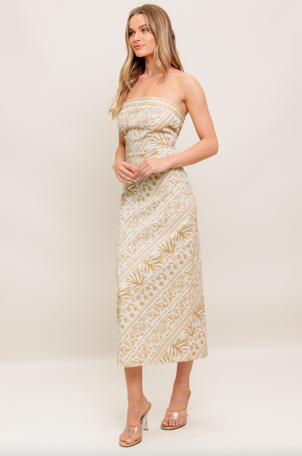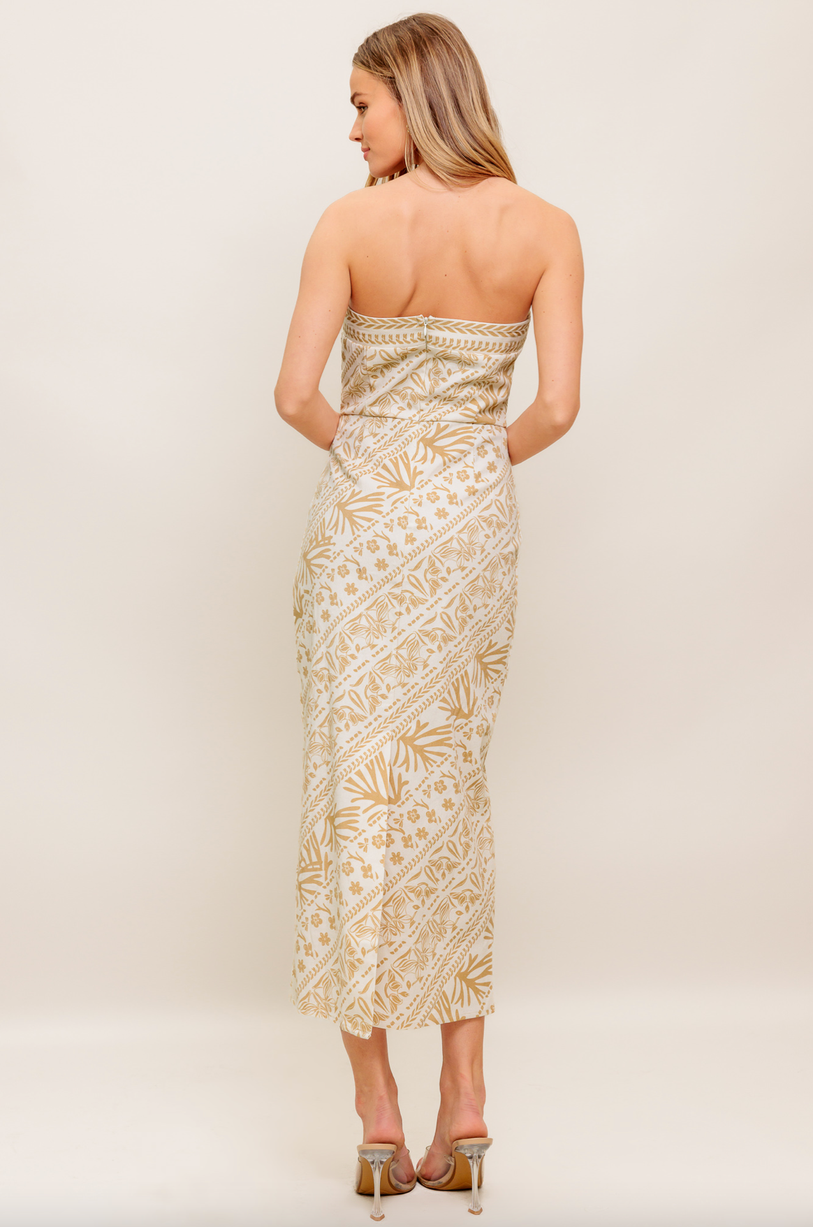 This printed woven midi dress showcases a strapless tube top, a flattering H-line skirt, and a convenient back zipper closure for easy wear.